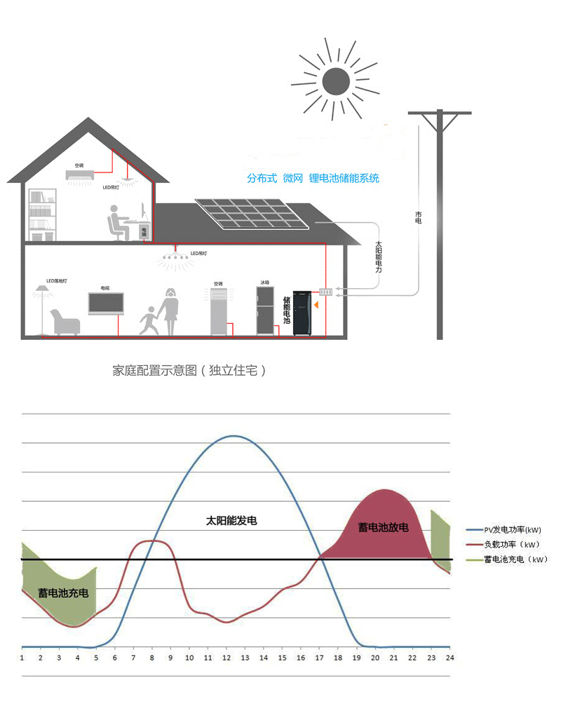 電力使用順序是:以太陽能電池為主,接下來依次為蓄電池及購買電力。白天充分利用太陽能電池發(fā)電并賣電,從傍晚開始,晚上通過利用蓄電池減少購買電力。蓄電池利用深夜電力進行充電,自動切換控制兩種電池。